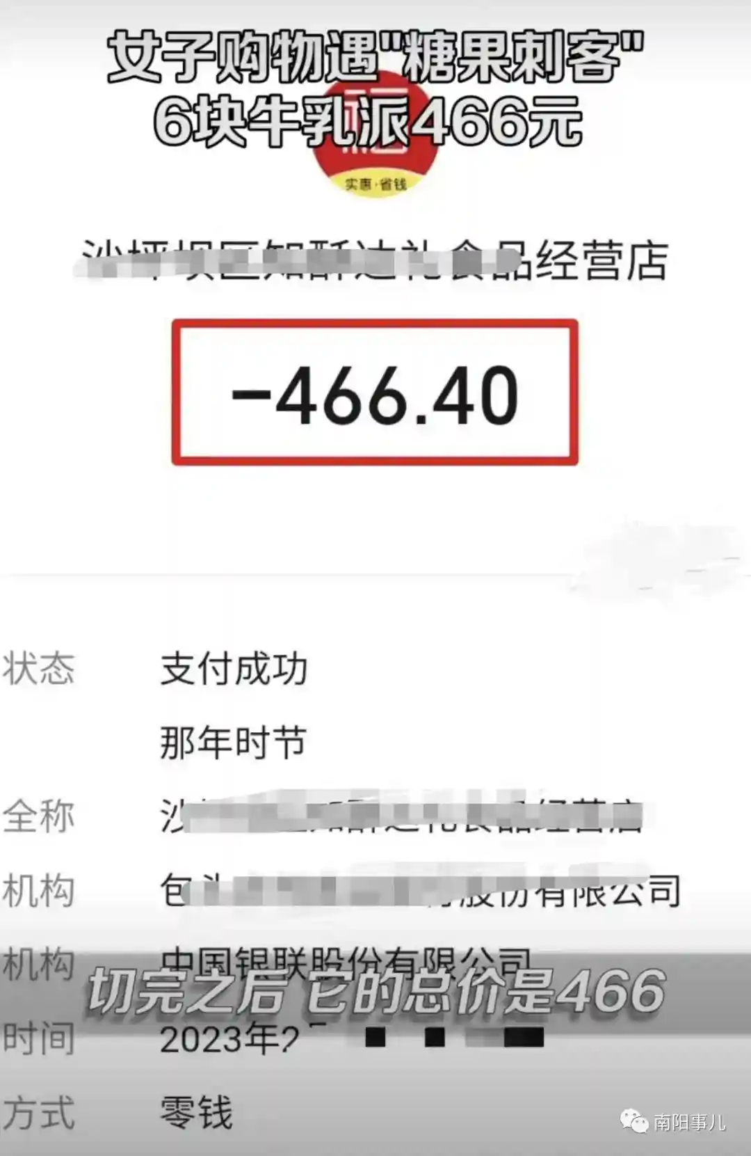 2月2日,重庆,蒋女士带着儿子去重庆磁器口逛街路过一家糖果店,品尝后选了4块牛乳派让店家称重算钱,店家却表示先切再算,并建议蒋女士再选一块,可以送一块。店家切完后称重,6块糖总价居然高达466元。