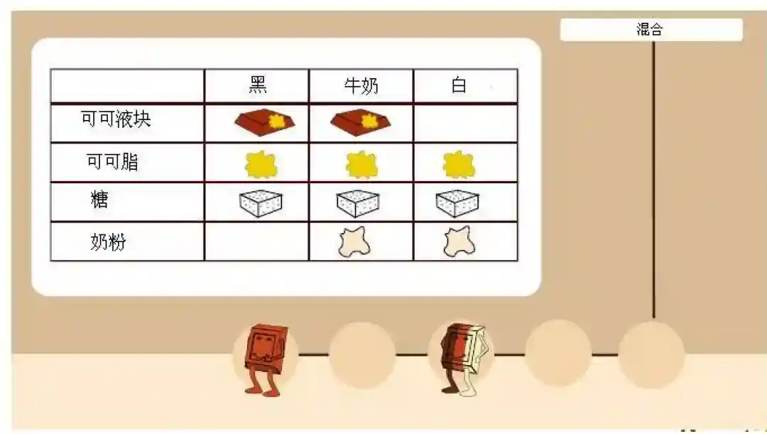 牛奶巧克力:至少含10%的可可浆及至少12%的乳质,由可可液块、可可脂、糖、奶粉制成。