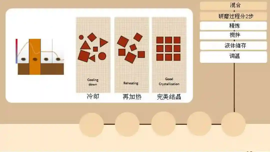 研磨:先粗磨打碎,再细磨制成可可液。