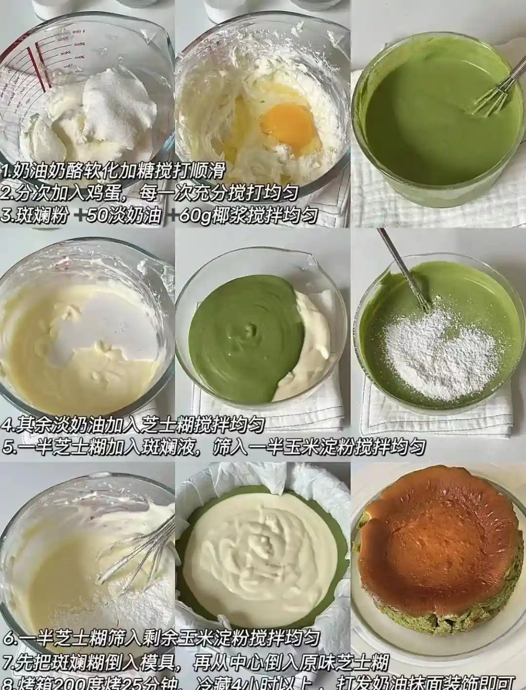 ②斑斓粉加入50g淡奶油和60g椰浆搅拌混合,其余淡奶油加入芝士糊搅拌均匀。