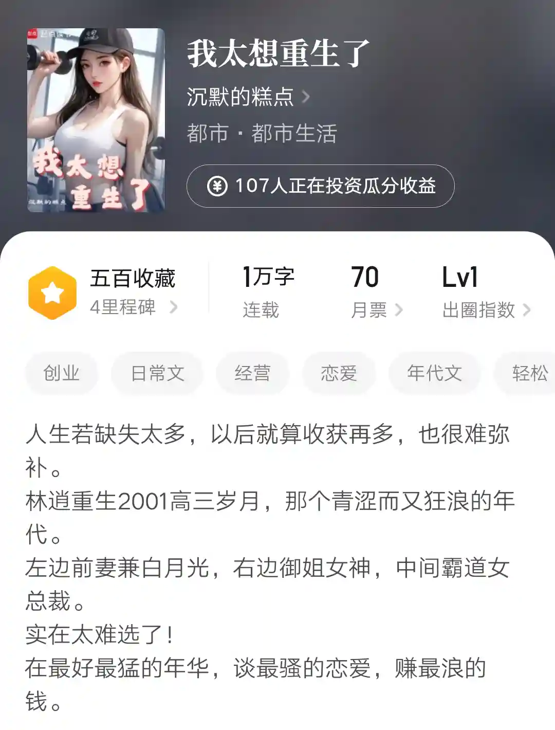 如今再写都市重生题材,看起来还是要延续之前大涅磐、重燃的路子,希望这次能稳定写到最后吧。