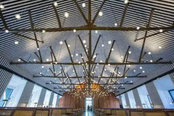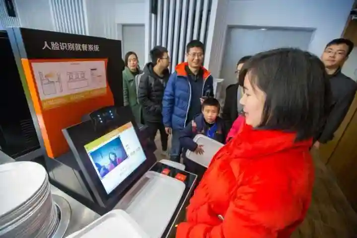 古朴老旧的房梁横纵交错,梁上垂挂着的一盏盏圆球状白灯如同星星般照亮整个大厅。二楼的食堂已经挤满了人,排队的、点餐的、吃上的,喧喧闹闹,大家都来体验浙大这家重新开张的食堂。据说在这里吃饭,可以精准计量、自主结算、刷脸支付,还能计算卡路里,果然又是别人家的大学食堂。
