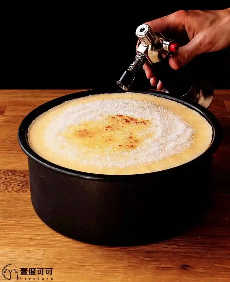 2、在表面撒上糖,用烤枪燃烧直到焦糖化。