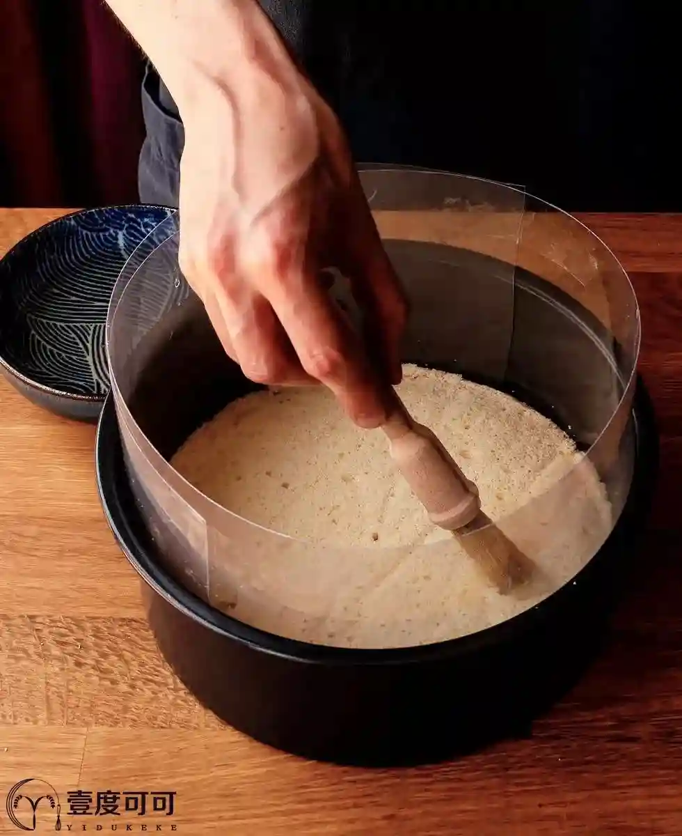 组装威士忌冰镇蛋糕。1、在模具的底座上放置一个20厘米防滑盘以固定蛋糕盘。