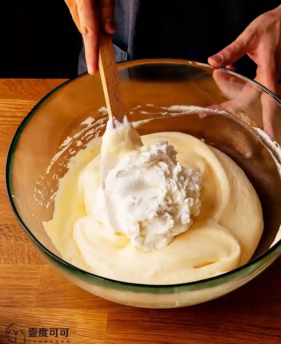 7、开始一点一点地加入面粉,均匀融入混合物中。