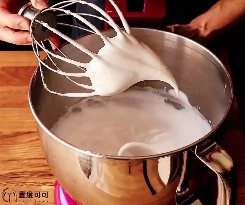 5、将蛋白与另一半糖混合,直到获得坚硬而有光泽的蛋白酥皮。