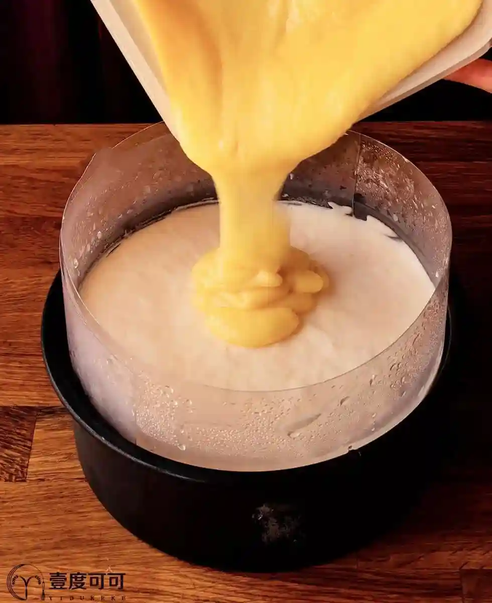 1、当我们把它从冰箱里拿出来的时候,让我们把蛋黄倒在冷冻的蛋糕上。