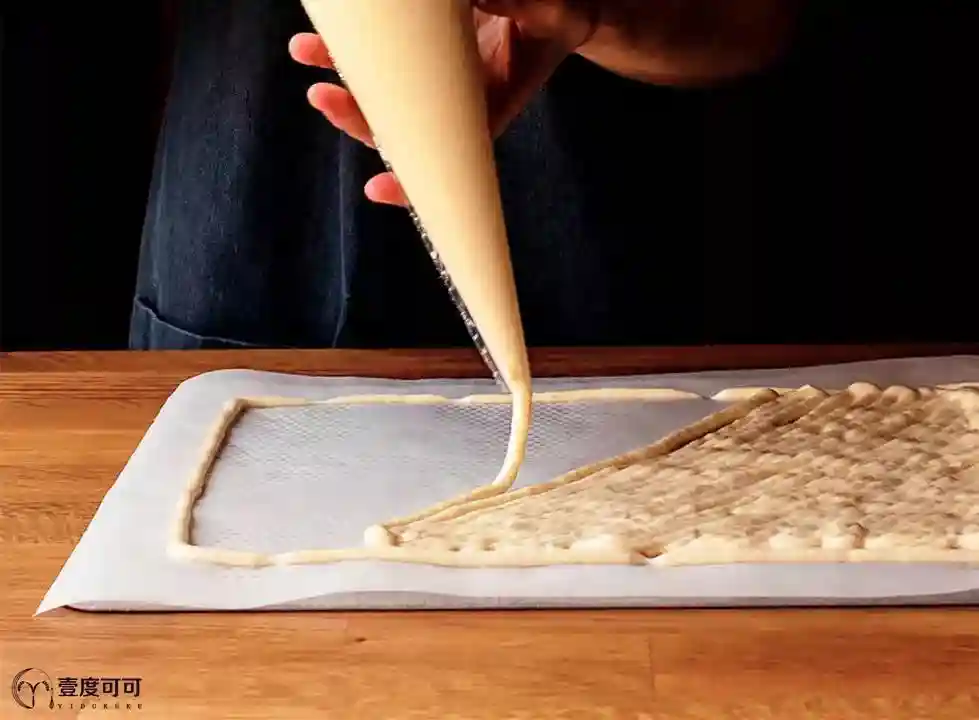 3、切掉裱花袋的尖端并将面糊放入托盘中,制作一个矩形,然后填充内部,尝试始终施加相同的压力。
