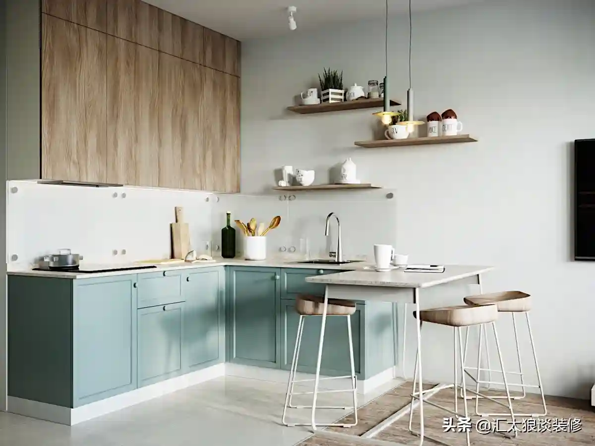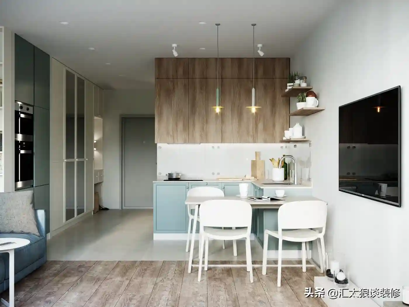 开放式厨房呈L型布局,这样可以获得更多的储物空间和操作空间,一个人生活,完全足够。橱柜上柜木色,下柜海蓝色,而操作台面和中间的墙面则选用白色,配上一蓝一白两盏吊灯,整个厨餐区显得清新淡雅极了。晚上灯光点亮时,也特别温馨有氛围。