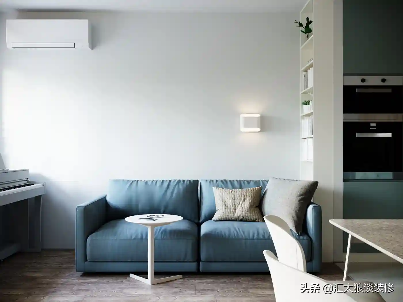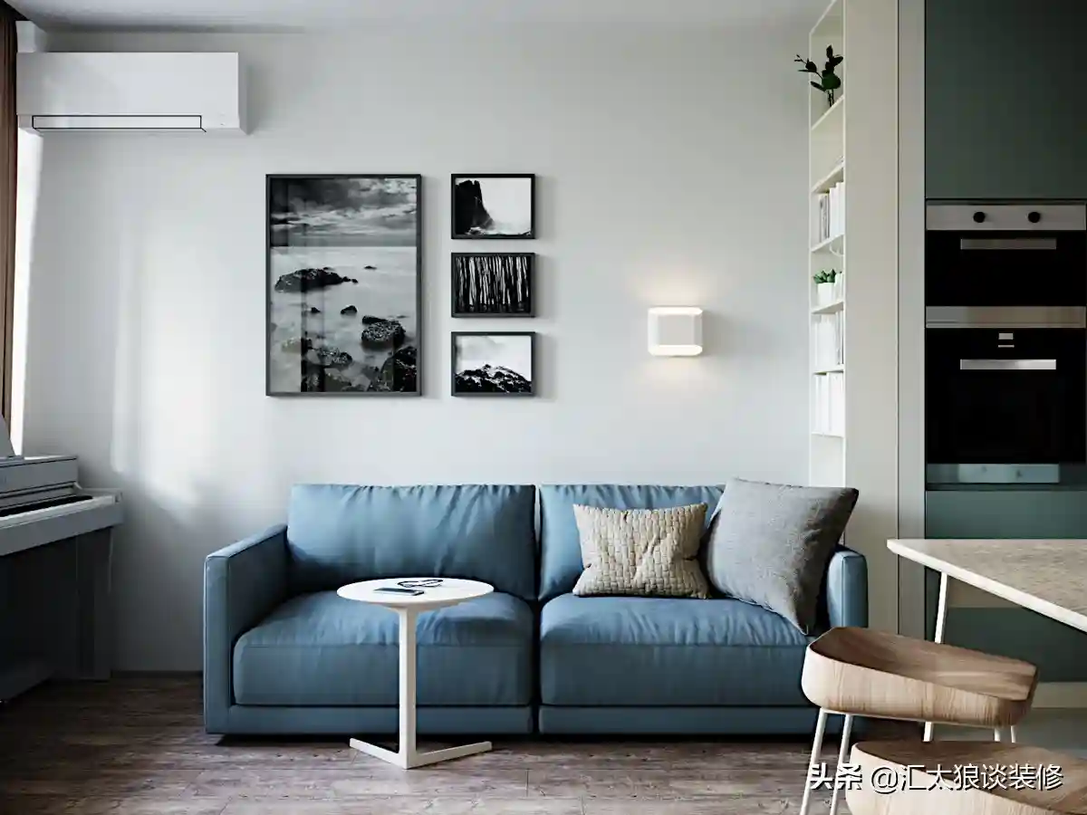 客厅这边白墙、浅色木地板,搭配一张蓝色的沙发,背景墙上无论挂画或是不挂画,都不影响其文艺清新的调调。