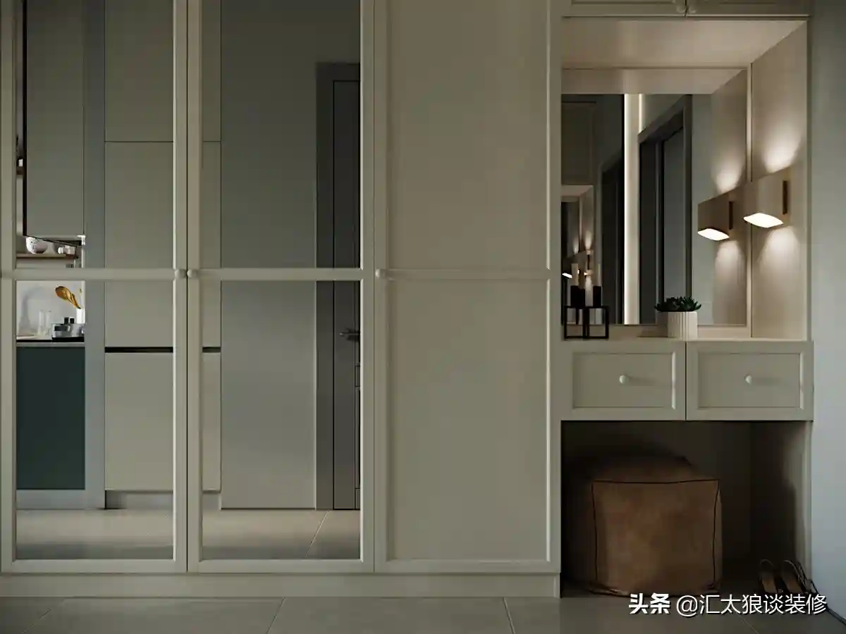 入户门右侧一整排定制柜,分别是梳妆台、鞋柜、衣帽柜、电器柜以及面朝沙发的书柜,功能齐全,外观又很简洁利落,整个立面整齐划一,材质、造型与配色上又各有不同,显得非常的精致。大门左侧的墙面上,挂了一面发光的全身镜,一进门,就感觉很温暖踏实。