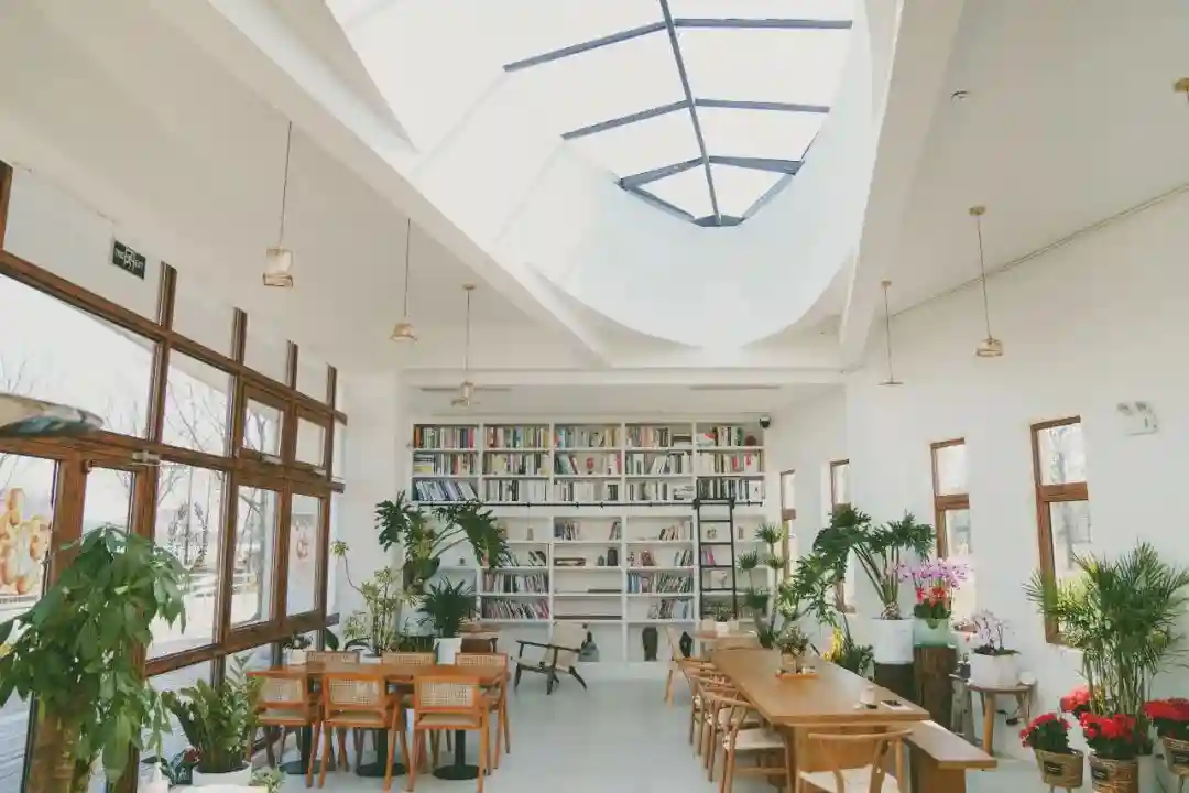 一艘“小白坞”,坞外草长莺飞,坞内阳光正好。阳光透着坞内落地窗、玻璃顶与咖啡和美景交相呼应,让人流连忘返。除了咖啡和美食、蛋糕小点,还有播放着爵士乐黑胶唱片机和一整面书墙,无论是独坐还是与朋友闲谈,或是在上海之鱼歇脚,这里都不会让你失望。