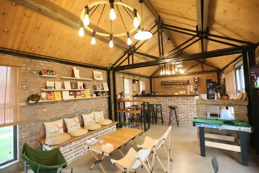 这是一间乡村咖啡屋,屋内墙体以及内部吧台均为红砖墙体,一半保留了建筑部分,一半根据修旧如旧的原则新建而成。复古的气息配上陈放老物件的岁月感,俨然给人一种岁月静好的感觉,一阵咖啡香气扑鼻而来,更为乡村的野增添一份静谧。