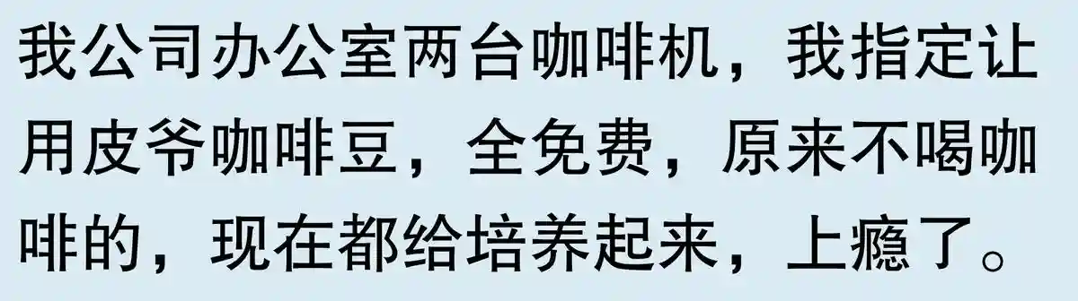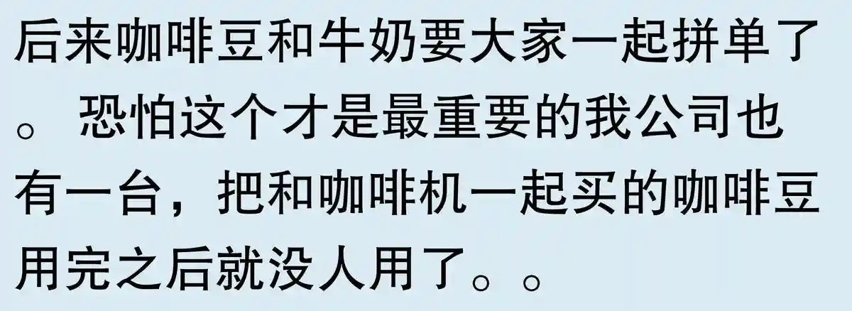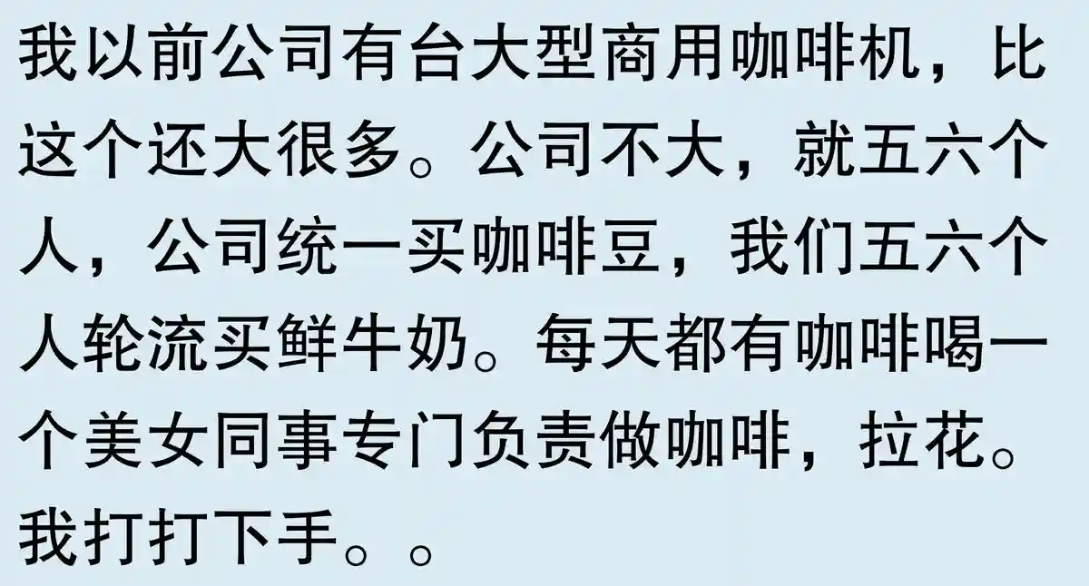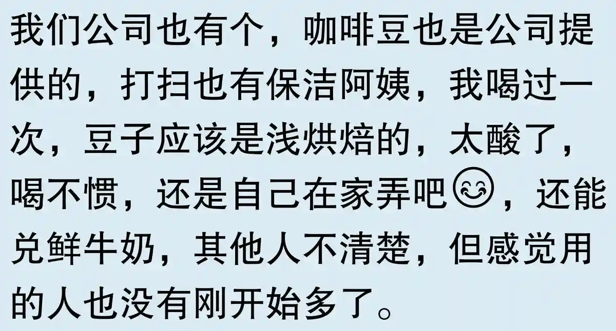 说明都凑热闹的,没有一个真的爱喝咖啡。我爱喝,我自费买了咖啡机,放自己办公室更衣间。第一台是滴滤式的,今年换成意式半自动的了。