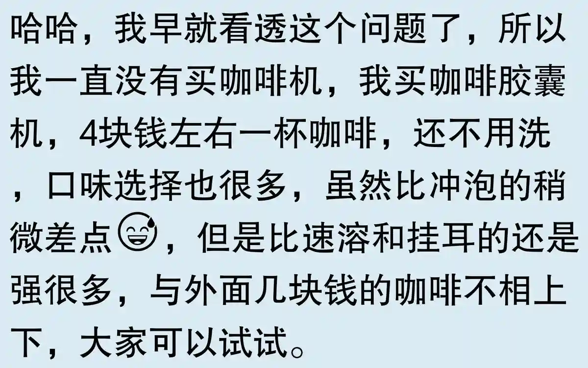 感谢分享,非常真实。我自从有了喝咖啡的习惯以后,纠结了好久要不要买咖啡机。后来还是放弃了,因为我仔细考虑了自己的需求只是咖啡因的摄入而不是享受制作的过程
