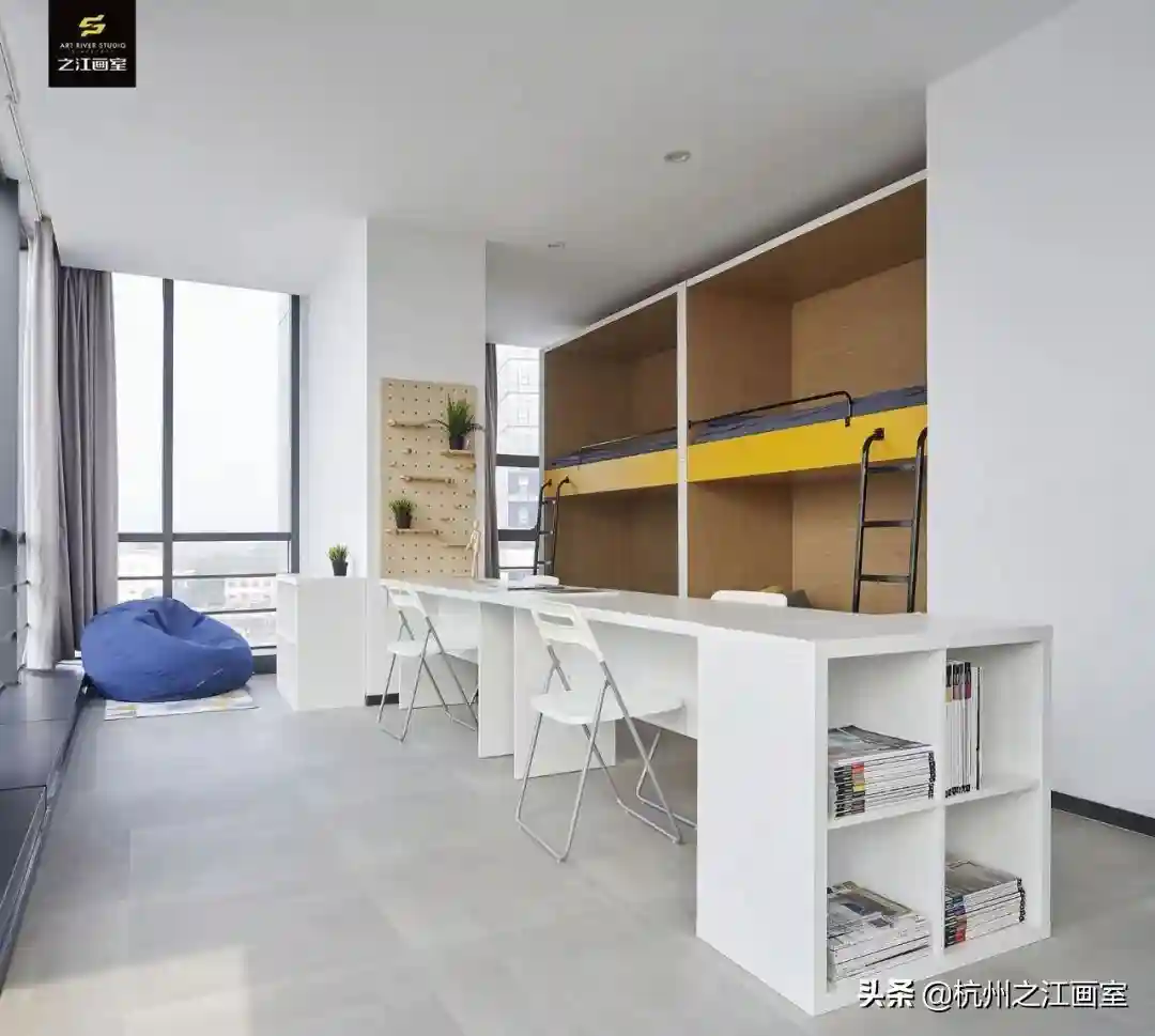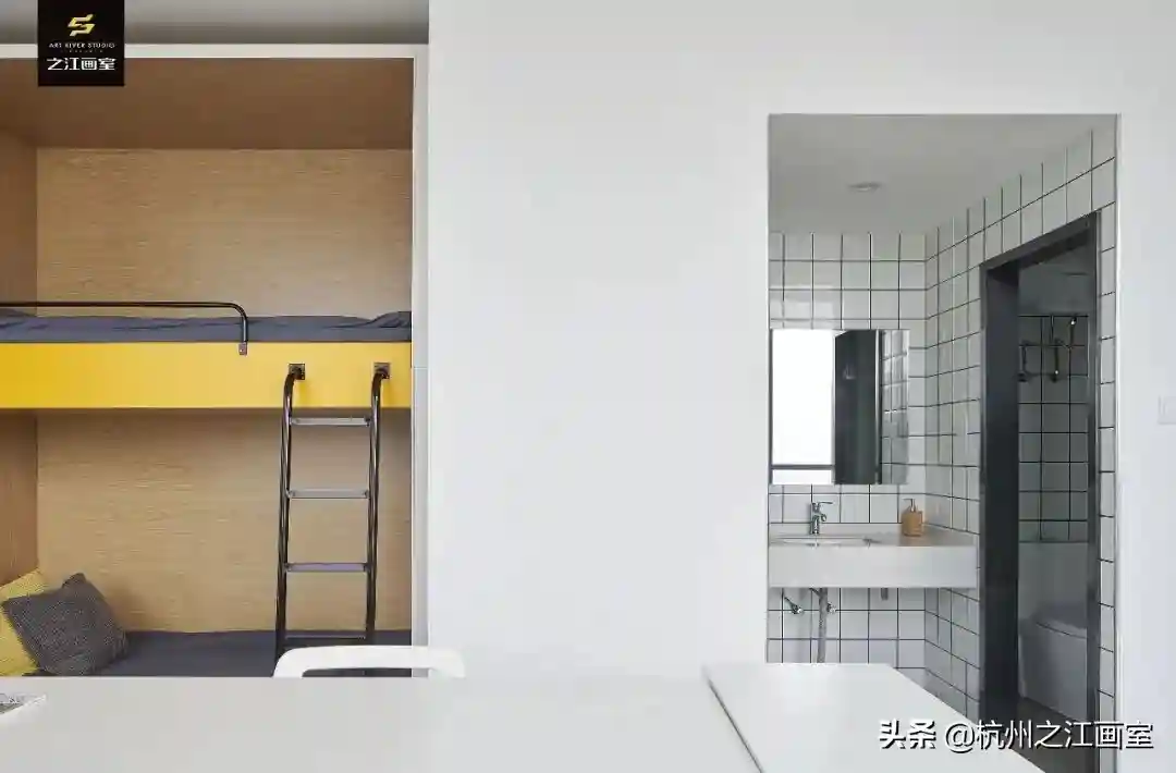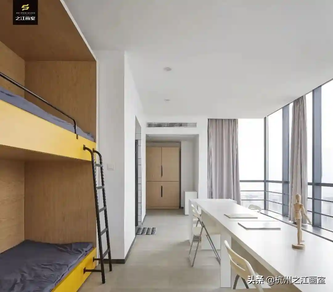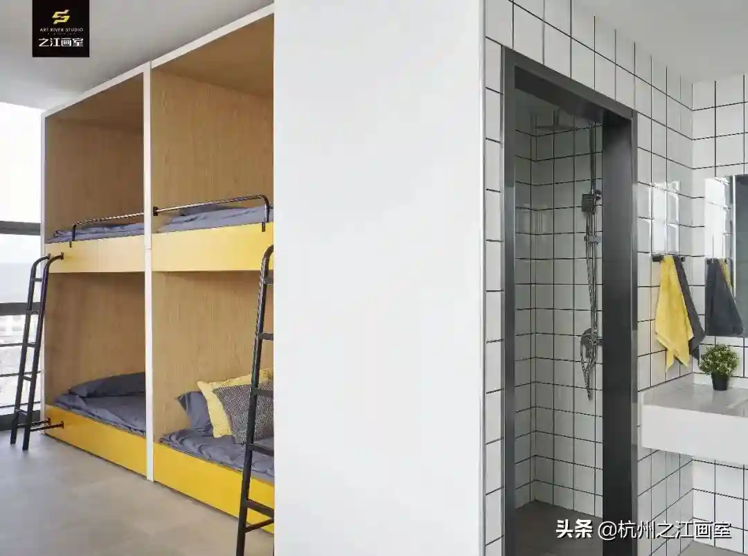 之江画室配有普通四、六人间及精致四、六人间,每间寝室宽敞大气,让人感觉轻松舒适,搭配明黄色床铺,格局显得素雅清明。