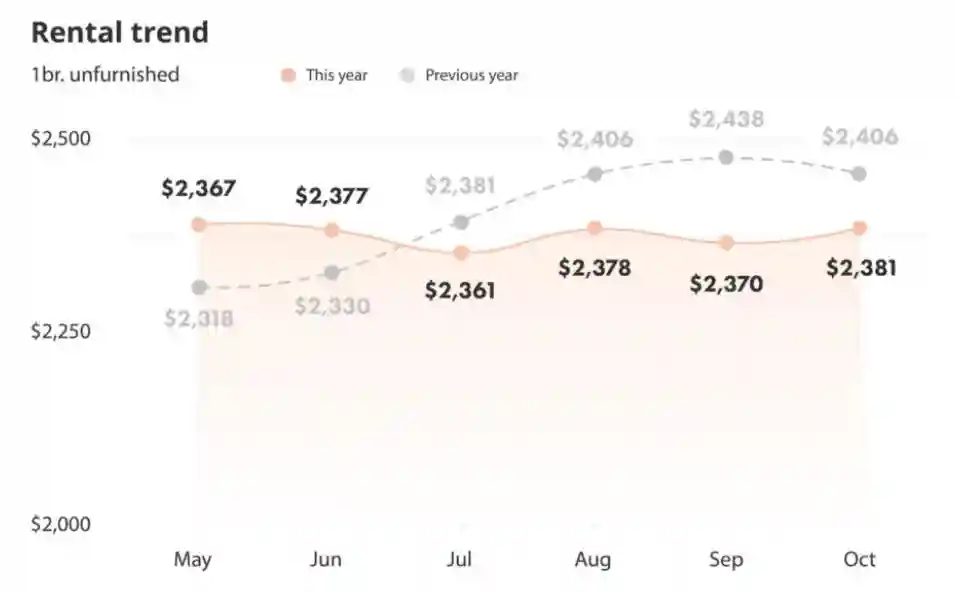 根据liv发布的最新报告,一套无家具一卧室出租单元的平均价格从今年9月份的$2370上涨了$11,达到现在的$2381。