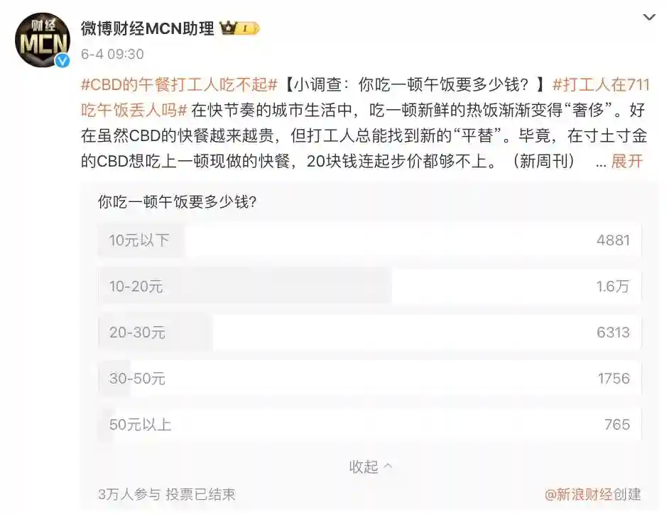 卷土重来今年4月,新浪财经在微博发起了一项“午饭要花多少钱”的小调查,参与投票的3万人中,午餐花费30元以内的人群占比超过9成。