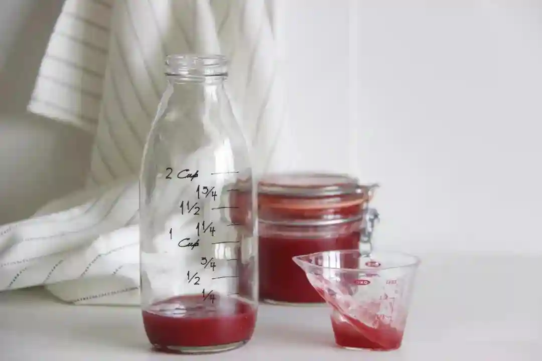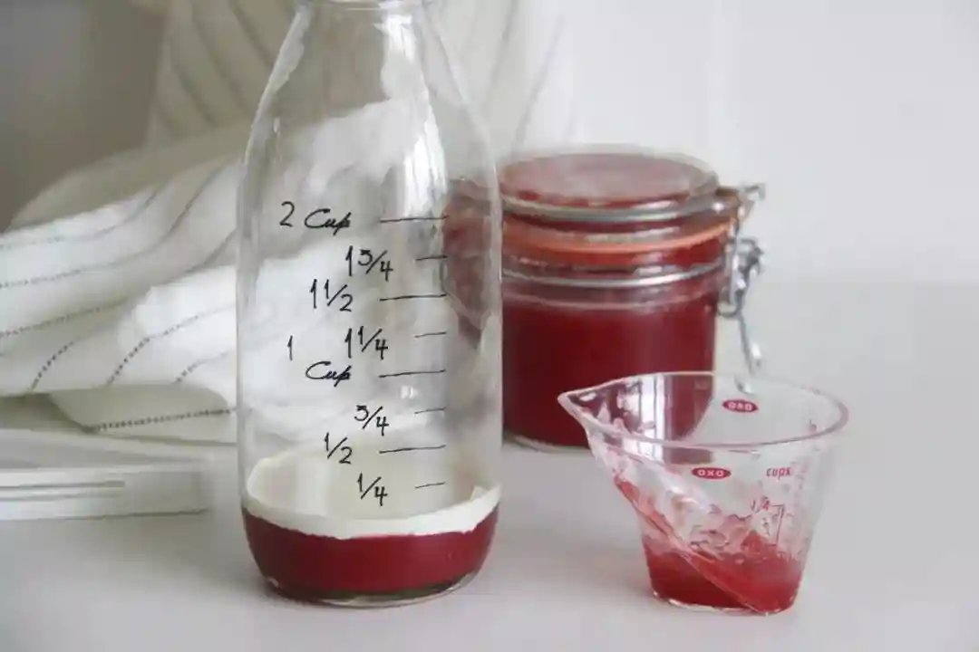 5/取三大勺草莓酱倒入瓶子内,用搅拌棒引流缓缓倒入淡奶油。