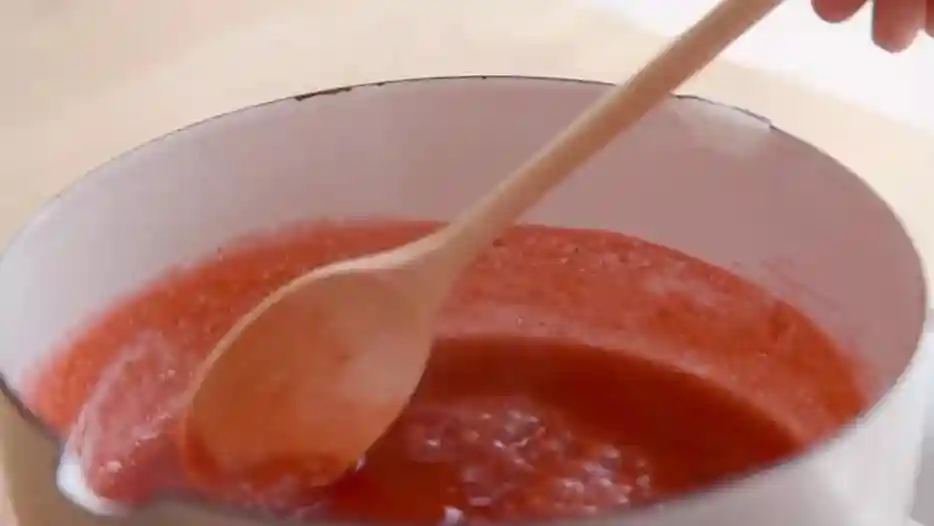 3/草莓酱煮开后撇去浮沫,继续小火熬煮15分钟,直至液体开始变得粘稠,关火晾凉。