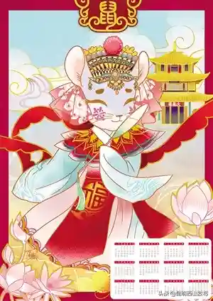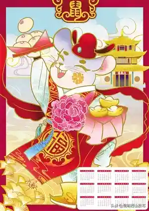 《双鼠送福》。整幅年画以中国大红色为主,融入民间嫁娶元素,色彩明艳,喜感满满。画中大观楼居正中位置,两侧分别是一雌一雄两只老鼠,双鼠身着带有“福”字的汉服,红色丝带随风扬,脚踏莲花,手托盘中含有金元宝以及糕点。天上祥云飘荡,地上银杏成行,这些是大观楼的元素,寓意鼠年喜庆之余收获满满。