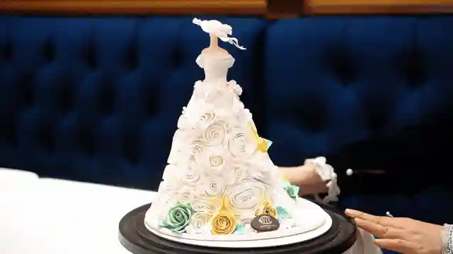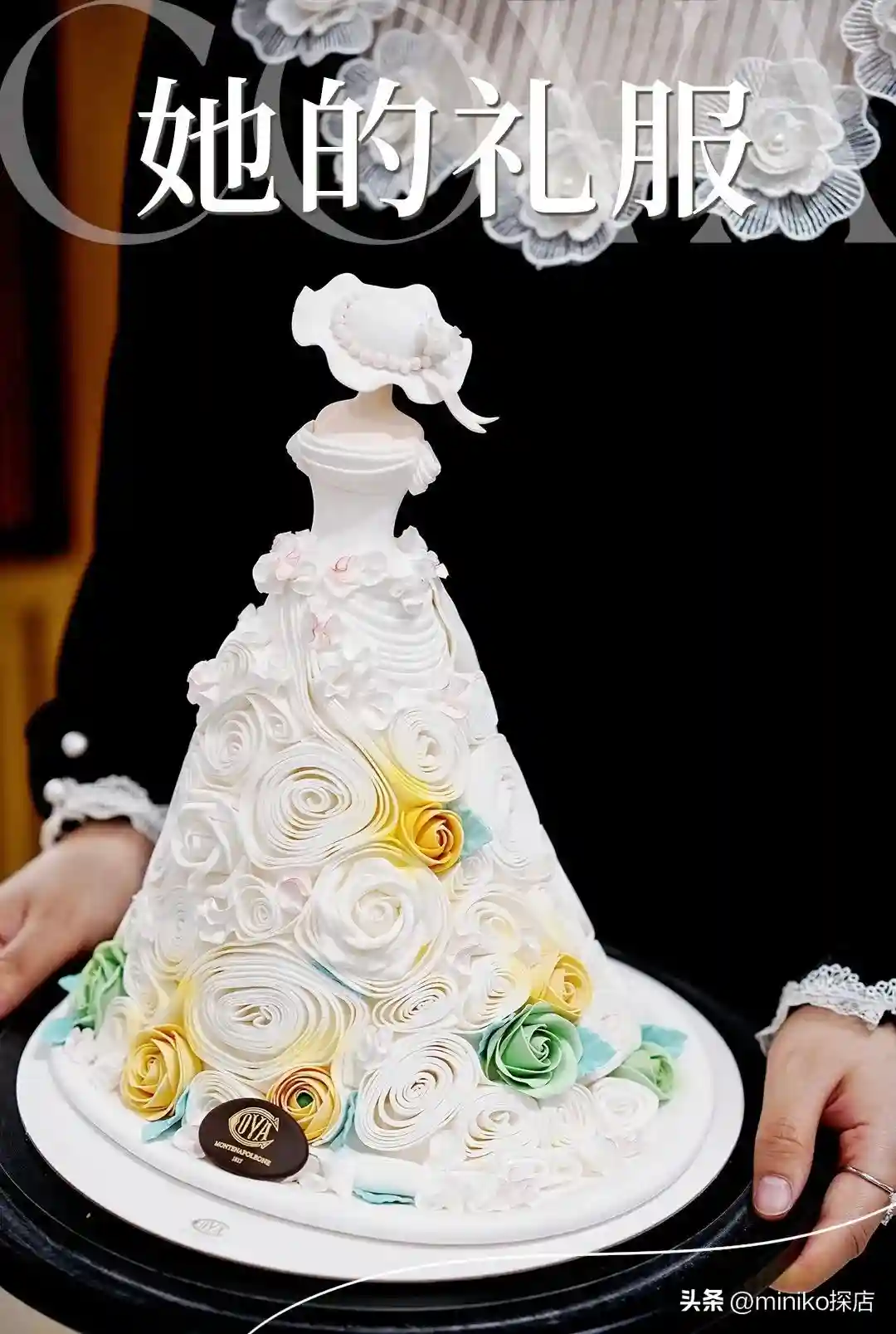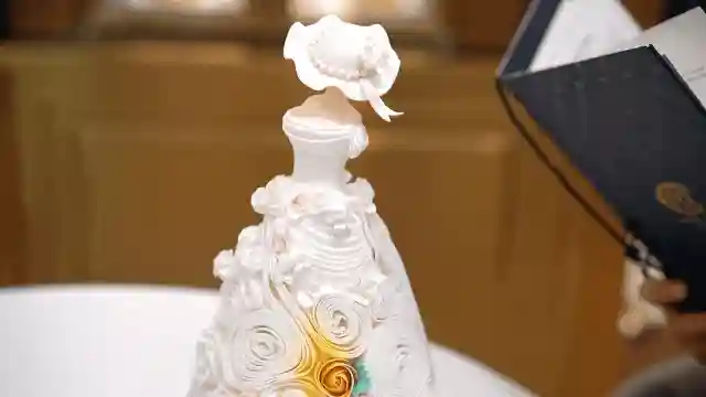 翻糖工艺打造的精美华丽的礼服和礼帽,礼服上巧妙装饰花朵的褶皱,优雅高级,梦幻时尚。