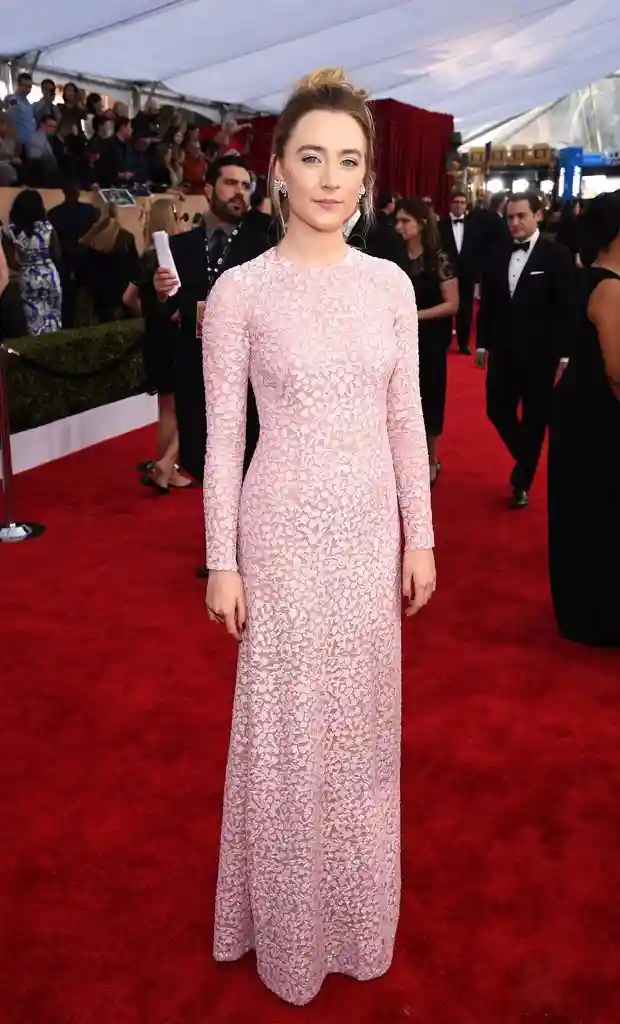 ↑最近1月末的演员工会奖上的罗南一席粉色贴身长裙不见了多余的赘肉痕迹