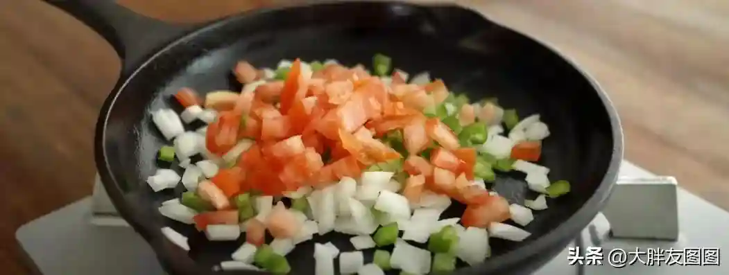 洋葱,番茄和青椒都切成丁,下油锅炒到断生。