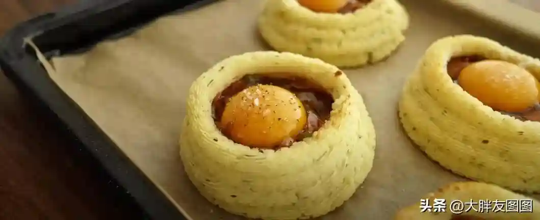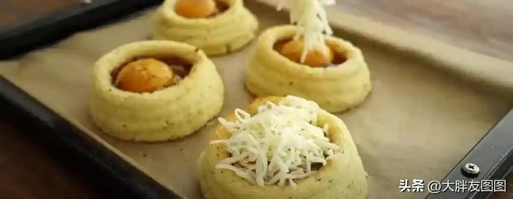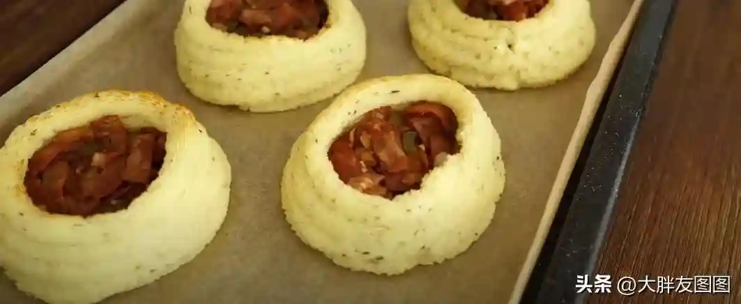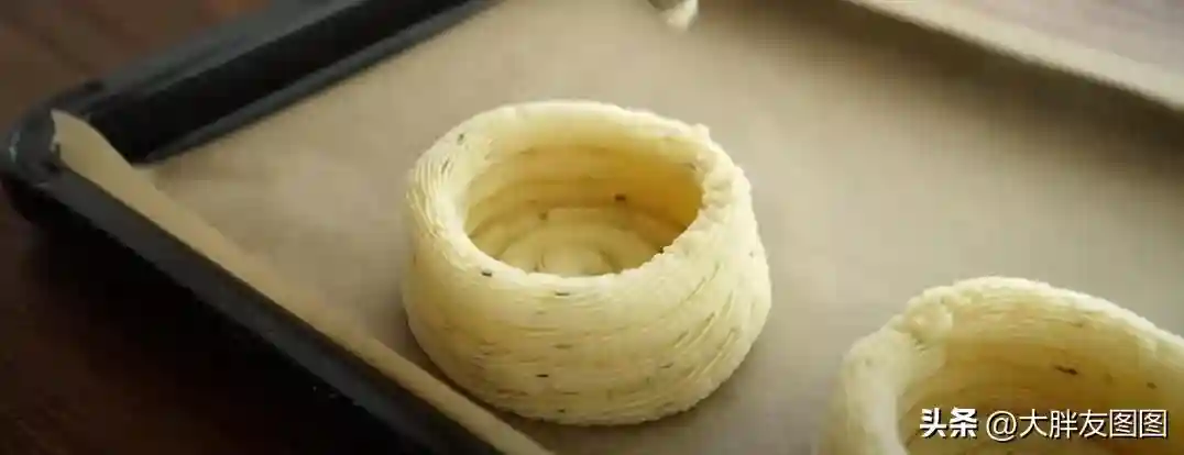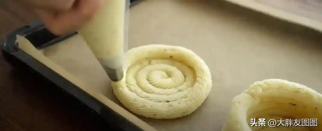 最后挤成一个挞的形状。送入烤箱。200度烤10分钟,让土豆泥做的挞皮得以定型。