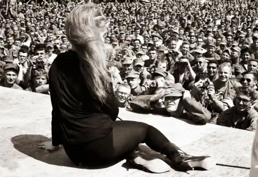台下的大兵们看呆了,他们把热切的双眼投向她“可人而疯狂摇晃的双腿”。