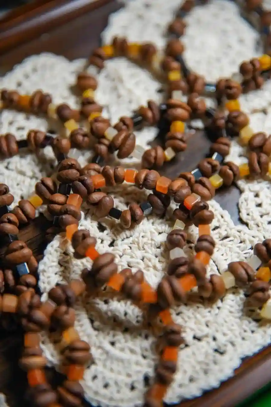 月更咖啡的小摊上,有摊主制作的咖啡手串,浅烘的咖啡豆搭配天然石料,手串精致又清新自然,咖啡星人的必备首饰没跑了。