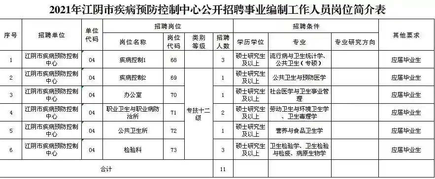 江阴市疾控中心公开招聘11名编制内工作人员,岗位涉及疾病控制、职业卫生、公共卫生、检验和办公室。