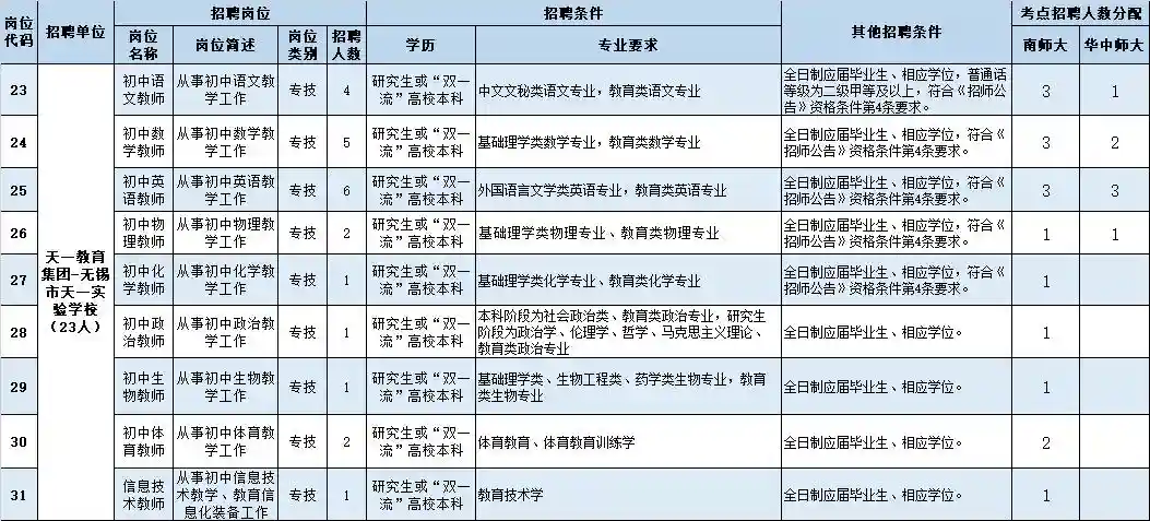 根据学校发展和学校教育教学实际需要,决定公开招聘2021年事业编制教师23名(其中语文4人,数学5人,英语6人,物理2人,化学1人,政治1人,生物1人,体育2人、信息技术1人)。如下表: