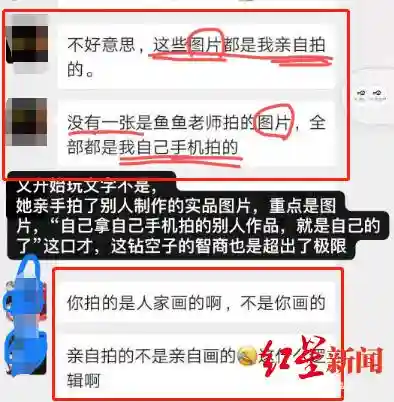 在一张群聊天截图中,红星新闻记者看到张老师对此作出解释:“这些图片都是我亲自拍的,没有一张是鱼鱼老师(南京老师)拍的图片,全部都是我自己手机拍的。”有人对此提出质疑,“亲自拍的不是亲自画的,这什么逻辑啊?”