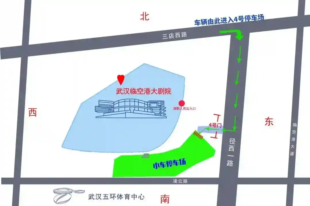 3月8日,来武汉临空港大剧院观演的观众可导航至“临空港文化中心”,经三店西路、径西一路进入4号门停车场(演职人员出入口附近),从停车场阶梯处上阶梯来到影城和大剧院观众厅入口。为避免交通堵塞,请您提前规划好出行路线,愉快观演!