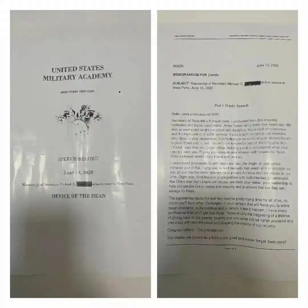 网传外泄的彭佩奥6月13日在西点军校演讲稿内容