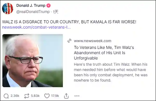 美国共和党总统候选人特朗普本周三(8月7日)在其自创社交平台发文称沃尔兹为“美国的耻辱”。