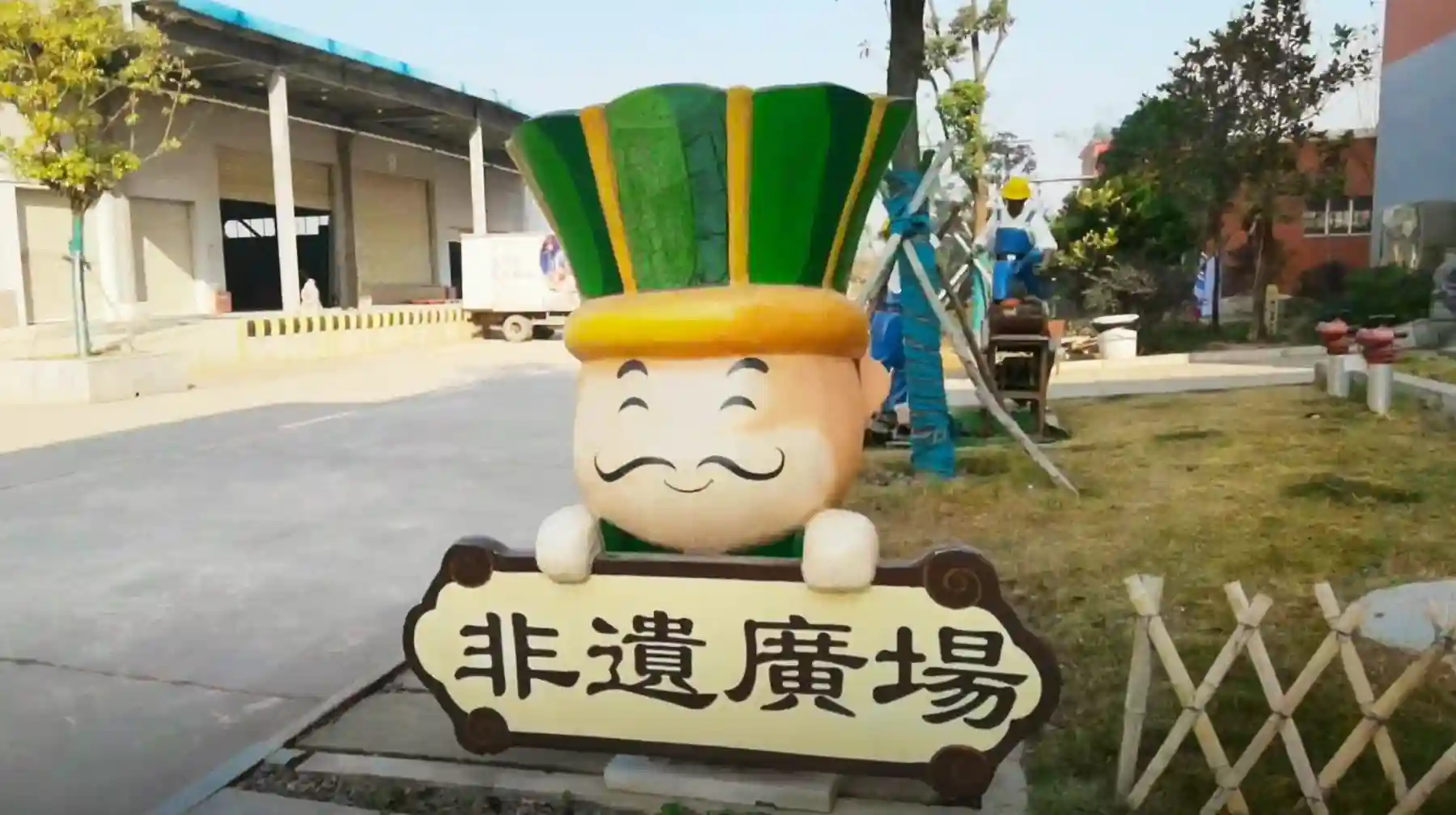 进到扬子江非遗文化馆,看到它的环境和想象完全不同。一般工业园里的企业,多是密集的厂房、板房,施工的声音不绝于耳,而这个文化馆却被密集的植被包围,其环境用“花园式工厂”形容丝毫不为过。大门处有像公园一样的盆栽和假山石,碑刻上是“扬子江非遗文化馆”的名字,路面非常开阔,行道树排列整齐,搭配了灌木从和路缘石,反倒是工厂的建筑密度很小,三四层的大楼,建在树林一侧,有一个池塘与曲形花园做界限。