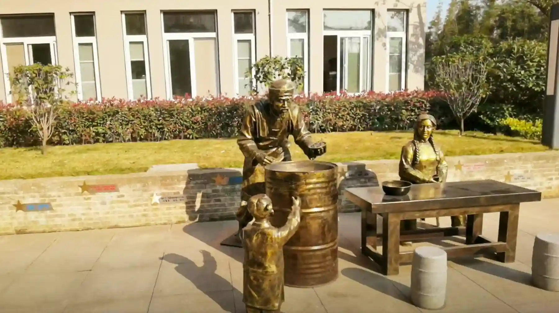 顺着卡通指引牌走过去,这边果然多了一处公共绿化区,规模还不小。有假山流水,有池塘和竹林,还有一座凉亭,建设的样式和公园没有区别。穿过凉亭,来到另一侧的建筑区,终于看到了一座大楼,在大楼前,是一排雕塑,真人一比一比例大小,展示的是传统手工艺人的形象。有的在做纺纱,有的在炸东西,有的在揉面,工具与道具数量丰富,还有小孩雕塑在旁边观赏。