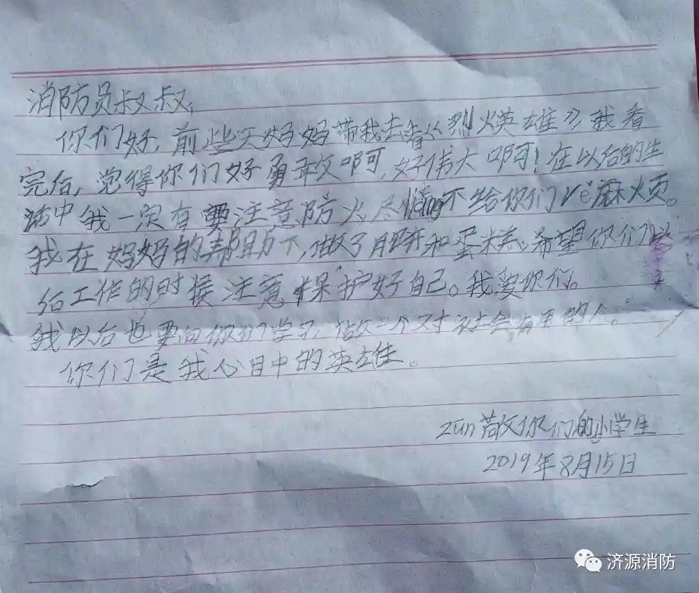 信中称,自己看完《烈火英雄》很感动,于是在妈妈的帮助下,特意制作了月饼和蛋糕送给消防员叔叔,希望以后工作的时候,注意保护好自己。这封铅笔写下的信件,让消防队员们感动不已。