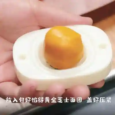15、在模具中放入包好馅的黄金芝士面团,盖好压紧