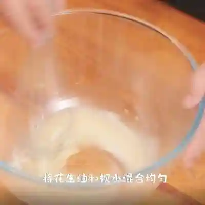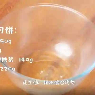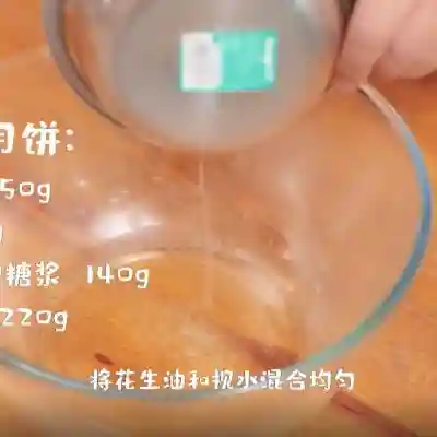18、接下来制作花生月饼。依次将花生油和枧水加入到碗中
