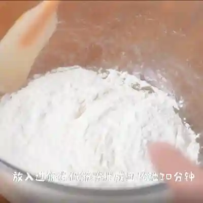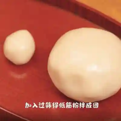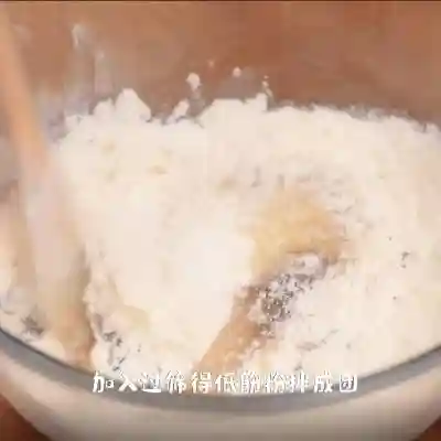 22、加入过筛后的低筋面粉,用橡皮刮刀搅拌均匀成团备用