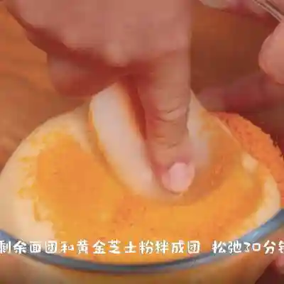 8、将剩余面团和黄金芝士粉拌成团,松弛30分钟