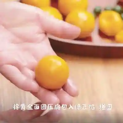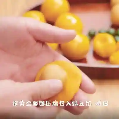 12、将黄金面团压扁包入绿豆馅