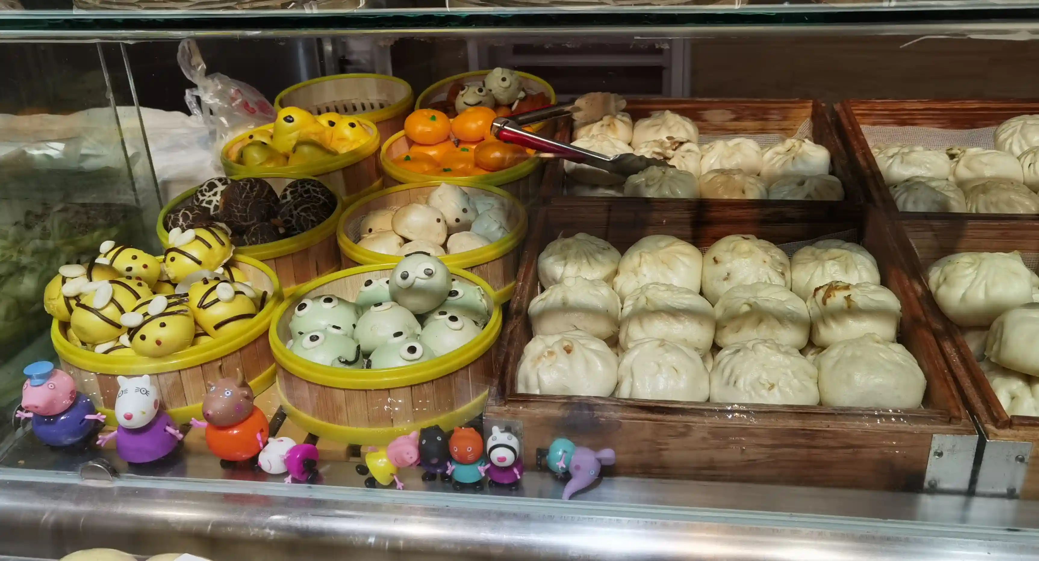 走近克拉玛依超市的主食厨房,油条、油饼、土豆丝饼、馍、馅饼、炒面、包子被摆放得满满当当;也能找到烤鸡翅、炸丸子、炸鸡柳、炸鸡腿、热狗等副食;甚至还有香菇包、橘子包、蜜蜂包、小黄鸭包这些象形夹心包点。
