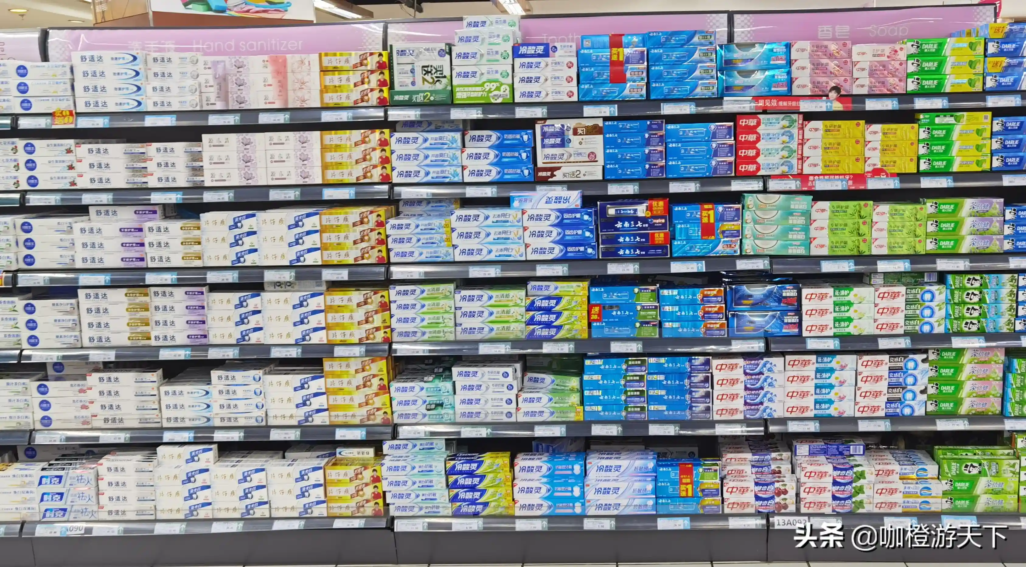 此外,商品的种类也是非常丰富。在纸尿裤的专柜里,产品摆满了5层货架一面墙。在牙膏货架上,也铺满了6层超过50种不同品类的牙膏。