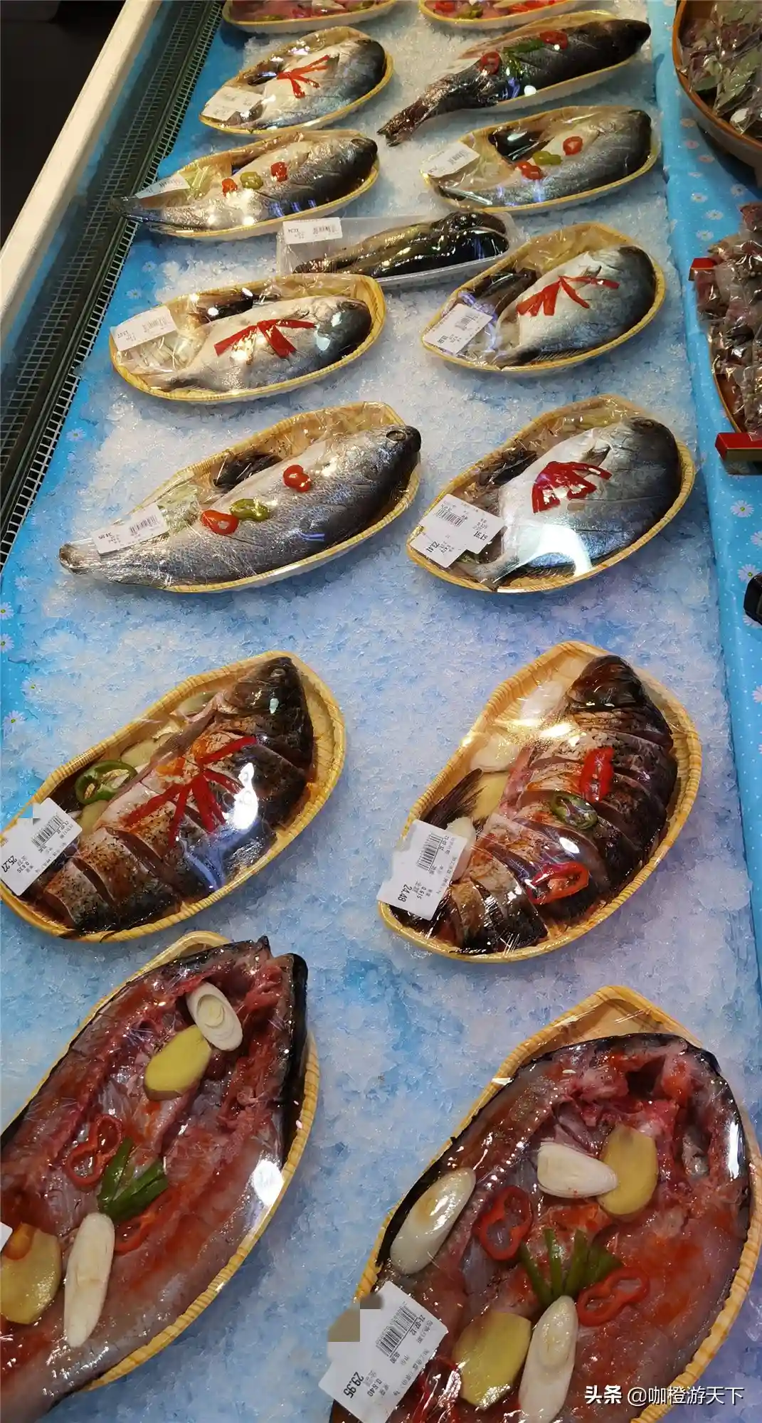 除了冷冻的鱼虾,就只有图中的这种“预制加工鱼”。一盒一盒已经去除鳞片与内脏,并且摆放好辣椒、大葱等辅料的金鲳鱼、草鱼,带回家就可以直接下锅,烹饪起来很是方便。