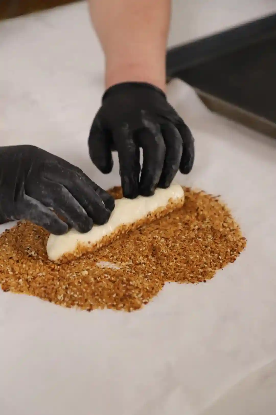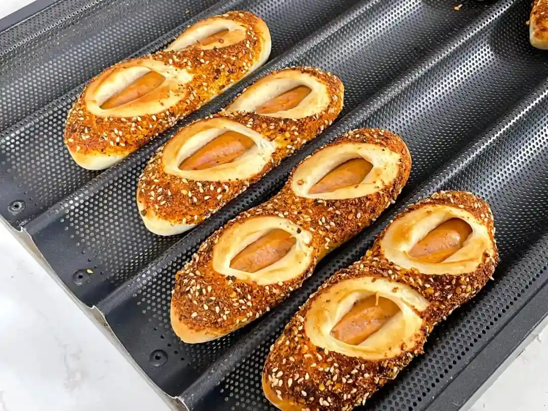 4。将松弛好的面包,排气拍长,挤一条芥茉籽酱,包入一根小龙虾肠,捏好接口,表面喷水沾麻辣芝士粉,放入法棍烤盘,