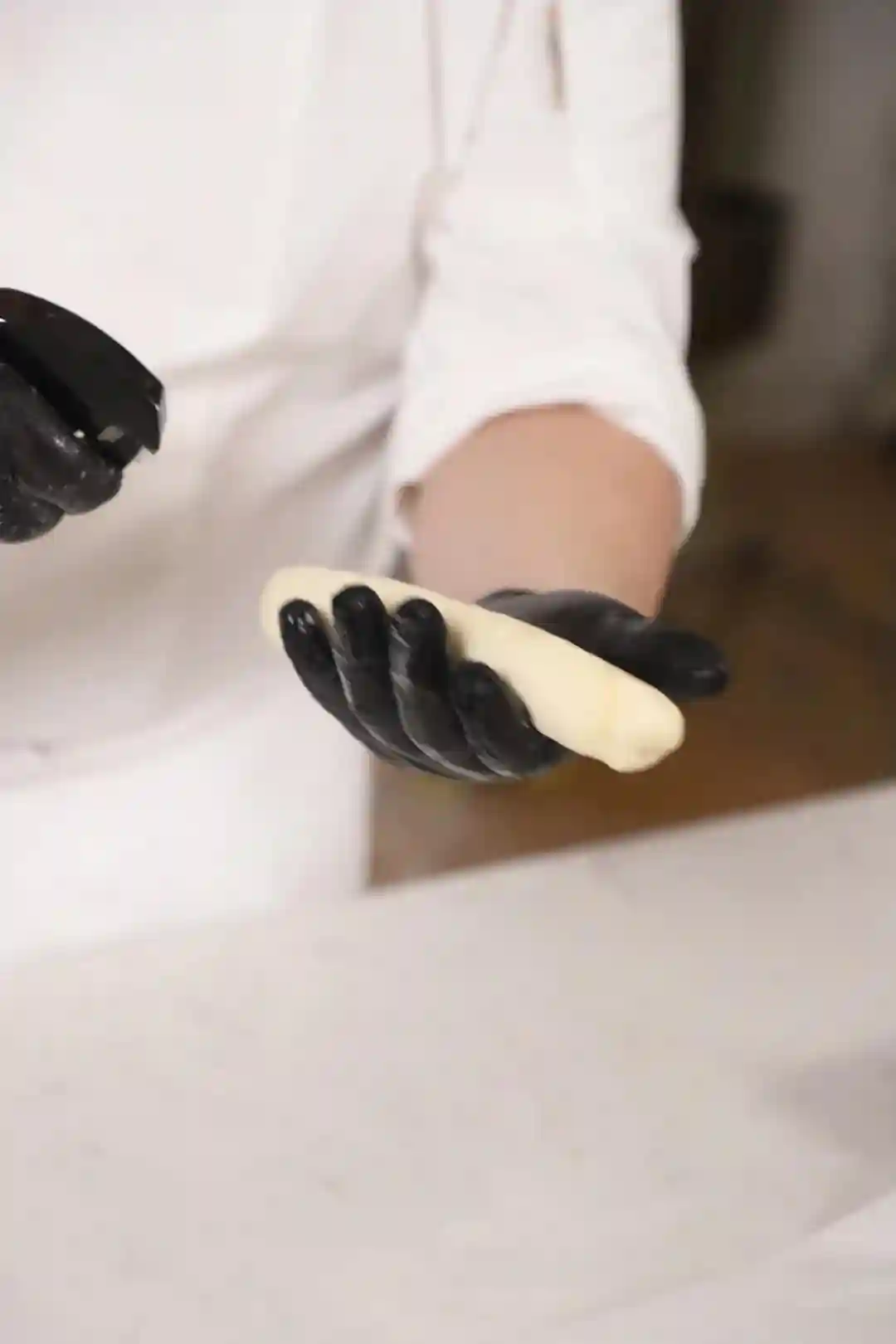 3.将基本醒发好的面包,分割70g一个,折叠成长方形,继续松弛30分钟。